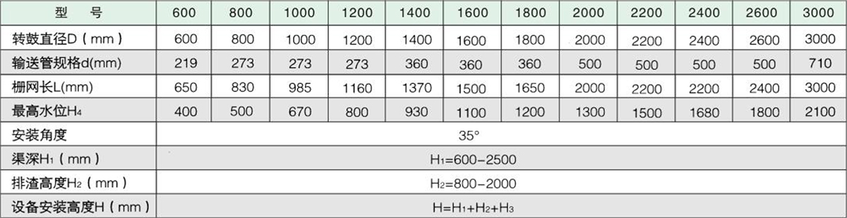 設(shè)備與水平面成35度安裝在水渠中,污水從格柵開式端口流經(jīng)柵條進(jìn)入渠道中,柵條將固體污物截留,到一定的水位差時(shí),定位在中心軸上的旋轉(zhuǎn)耙在柵鼓內(nèi)旋轉(zhuǎn),旋轉(zhuǎn)耙耙齒插入格柵條內(nèi)將格柵條清潔,并帶動(dòng)向上運(yùn)轉(zhuǎn)。當(dāng)運(yùn)行至高點(diǎn)時(shí),所有柵渣落入中央柵渣螺旋槽內(nèi),并通過中央柵渣螺旋槽內(nèi)螺旋輸送壓榨機(jī)擠干、脫水,并運(yùn)至上端排料斗排出。